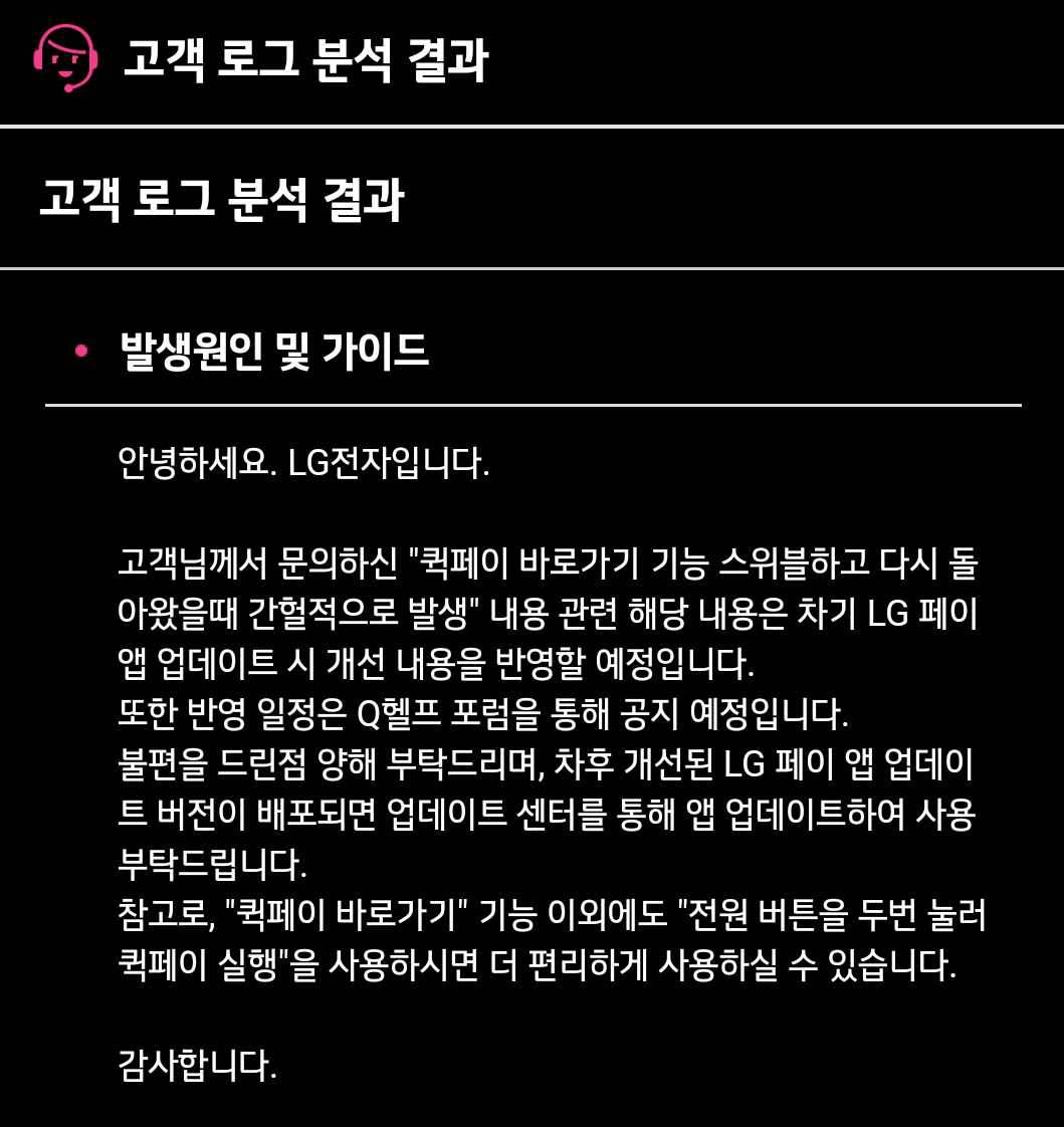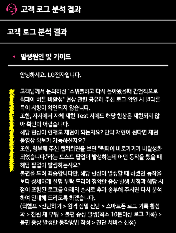 다시 제보한 후 하루 만에 답변 받은 내용입니다. 제가 제보한 증상은 재현 경로가 명확하여 쉽게 확인할 수 있는 문제였어서 신속하게 처리되었던 것 같습니다. 유저는 이 과정에서 제조사의 문제인지, 앱의 문제인지 안내받을 수 있고, 제조사의 문제라면 추후 S/W 업데이트에 반영되도록 유관부서에 전달됩니다.