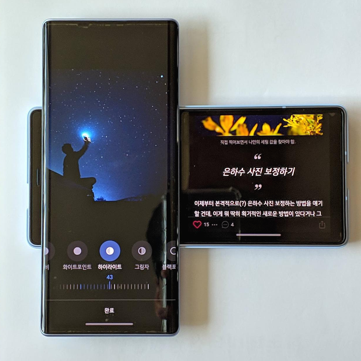 주로 구글 포토 앱을 사용하여 사진을 편집합니다. 색감 보정을 할 때 스크랩해둔 사진들을 참고하는데요. LG WING의 ㅏ 스위블 모드를 활용하면 앱 전환 없이 편하게 진행할 수 있습니다!