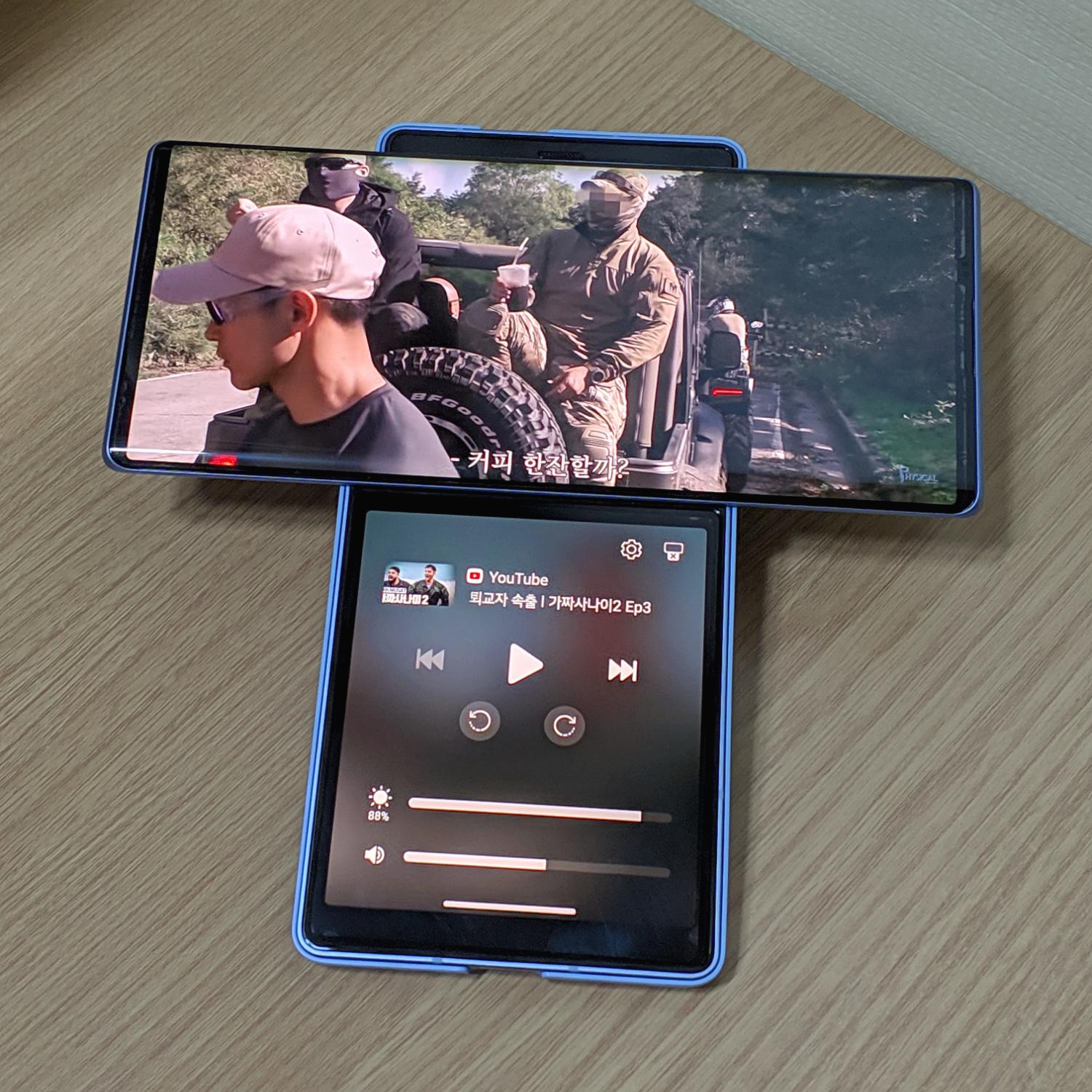 유튜브앱에서 영상을 재생하면 세컨드 디스플레이에는 이와 같이 미디어 컨트롤러를 띄울 수 있습니다. 컨트롤러가 아닌 다른 앱을 실행하고 싶다면 홈화면으로 나가면 되고, 다시 컨트롤러를 띄우려면 오른쪽에 작은 화살표를 터치하면 됩니다.