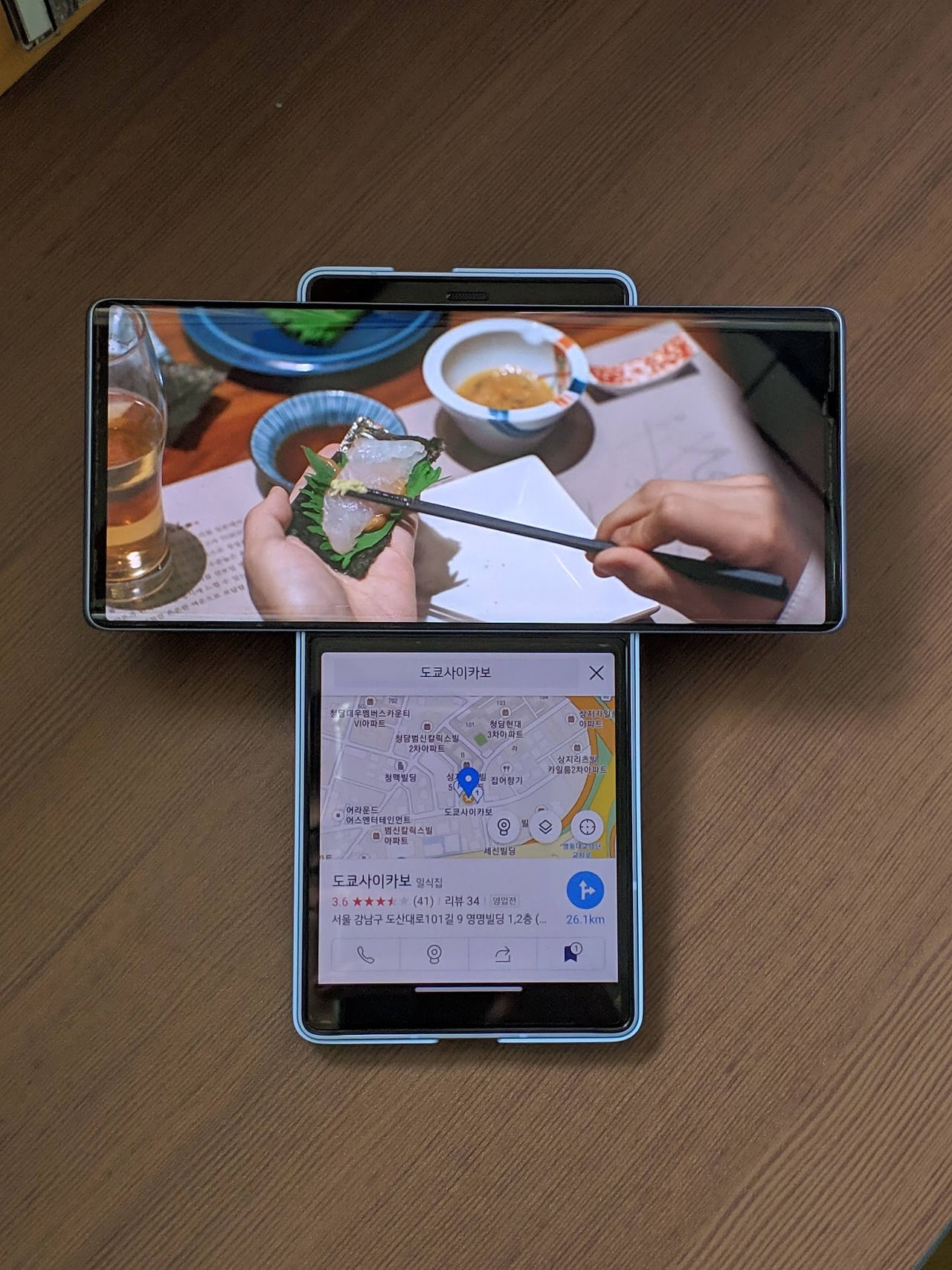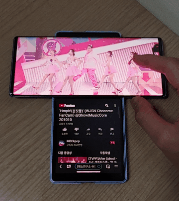 LG WING은 사용자가 파지법을 바꾸면 인터페이스도 함께 따라서 바뀝니다. 넓은 자판에서 타이핑 하고싶다면 ㅜ 모드로, 영상을 작게 띄우고 웹서핑을 크게 하고 싶다면 ㅓ ㅏ 모드로 언제든 전환할 수 있어 사용자 자유도가 정말 높았습니다.