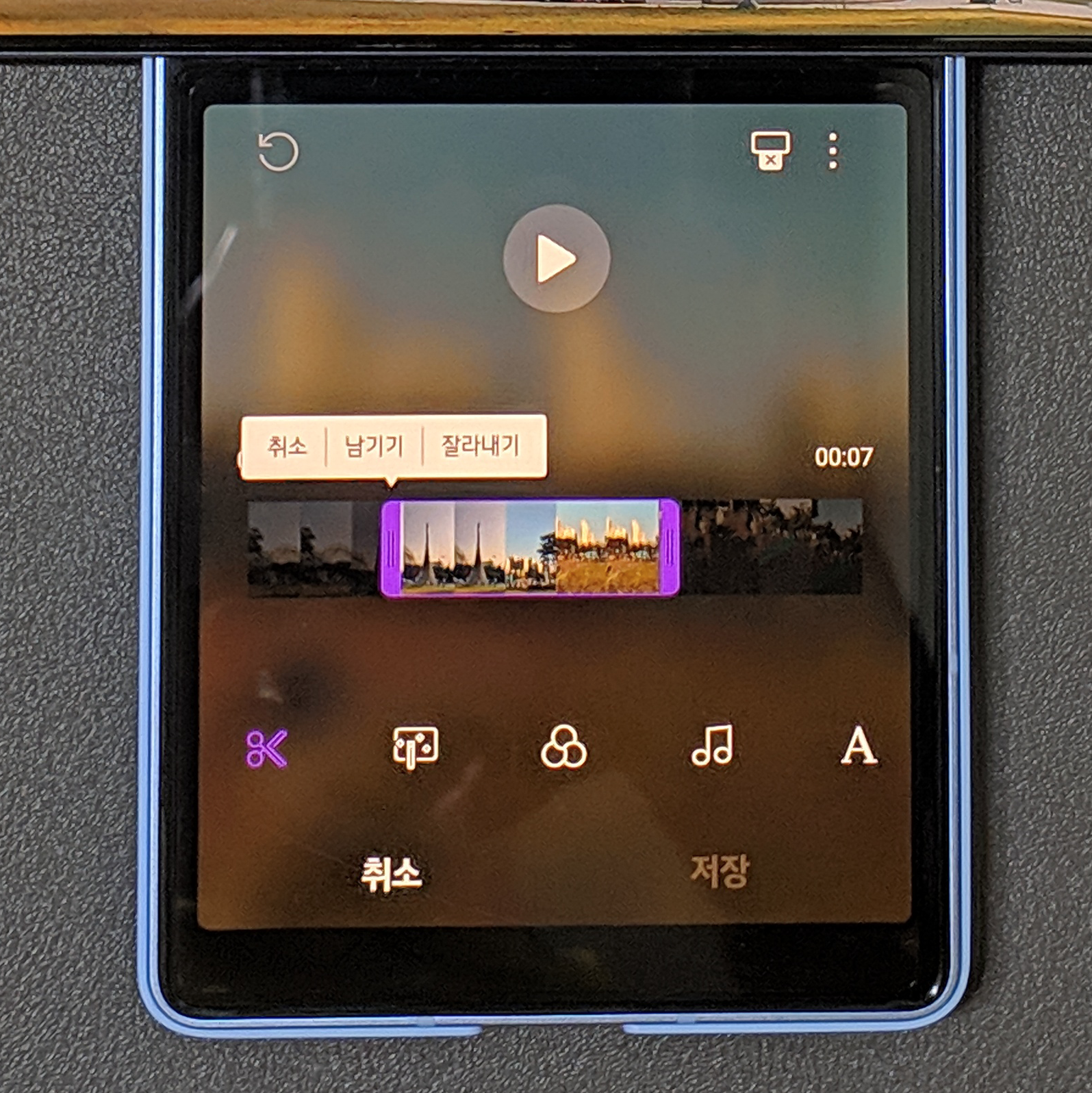 이 비디오 에디터가 LG WING의 스위블 모드를 지원하여 메인스크린에는 편집할 동영상의 미리보기를, 세컨드스크린에는 각종 편집도구를 띄워 컨트롤할 수 있어요.