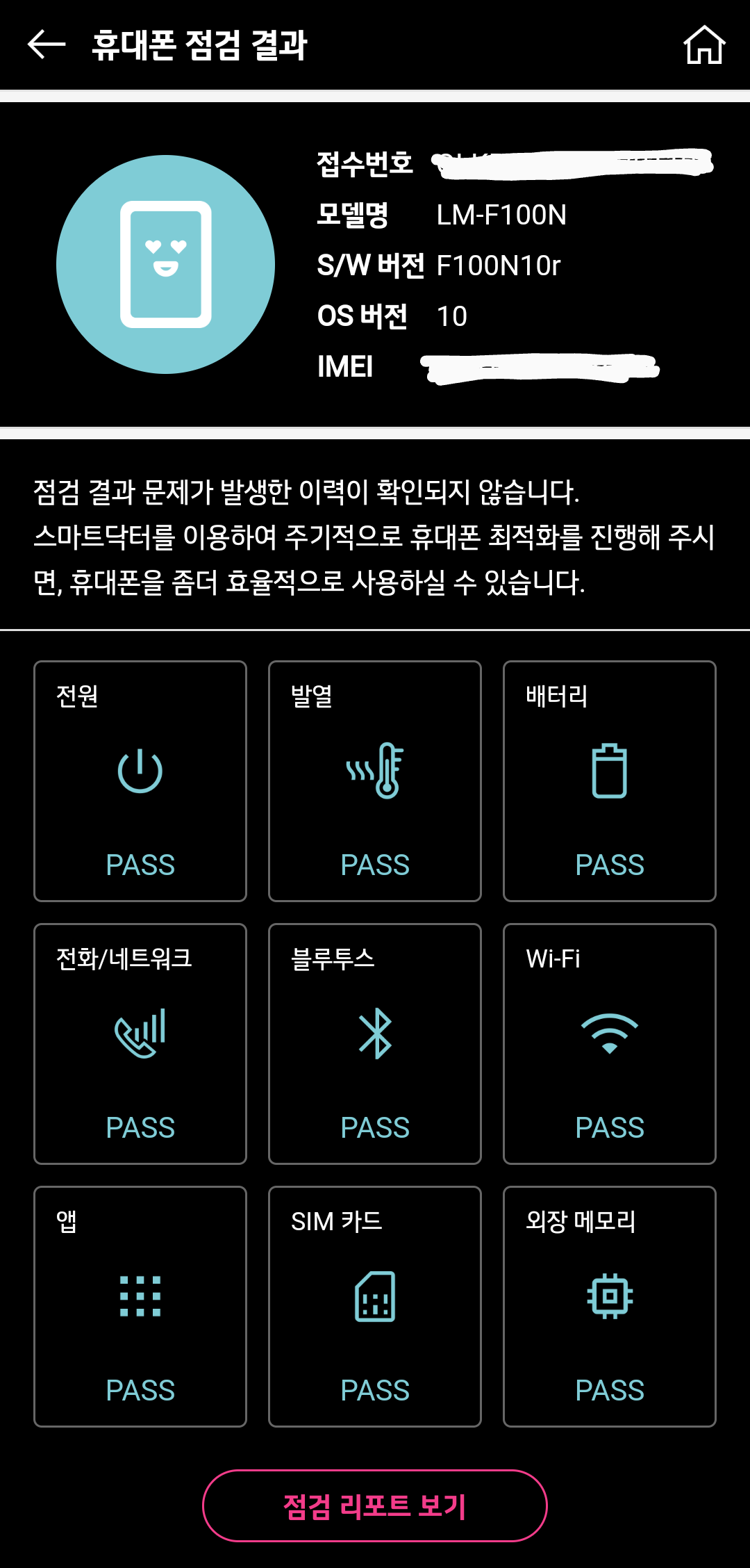 제 휴대폰의 진단결과는 ALL PASS 입니다. 깨-끗하네요!